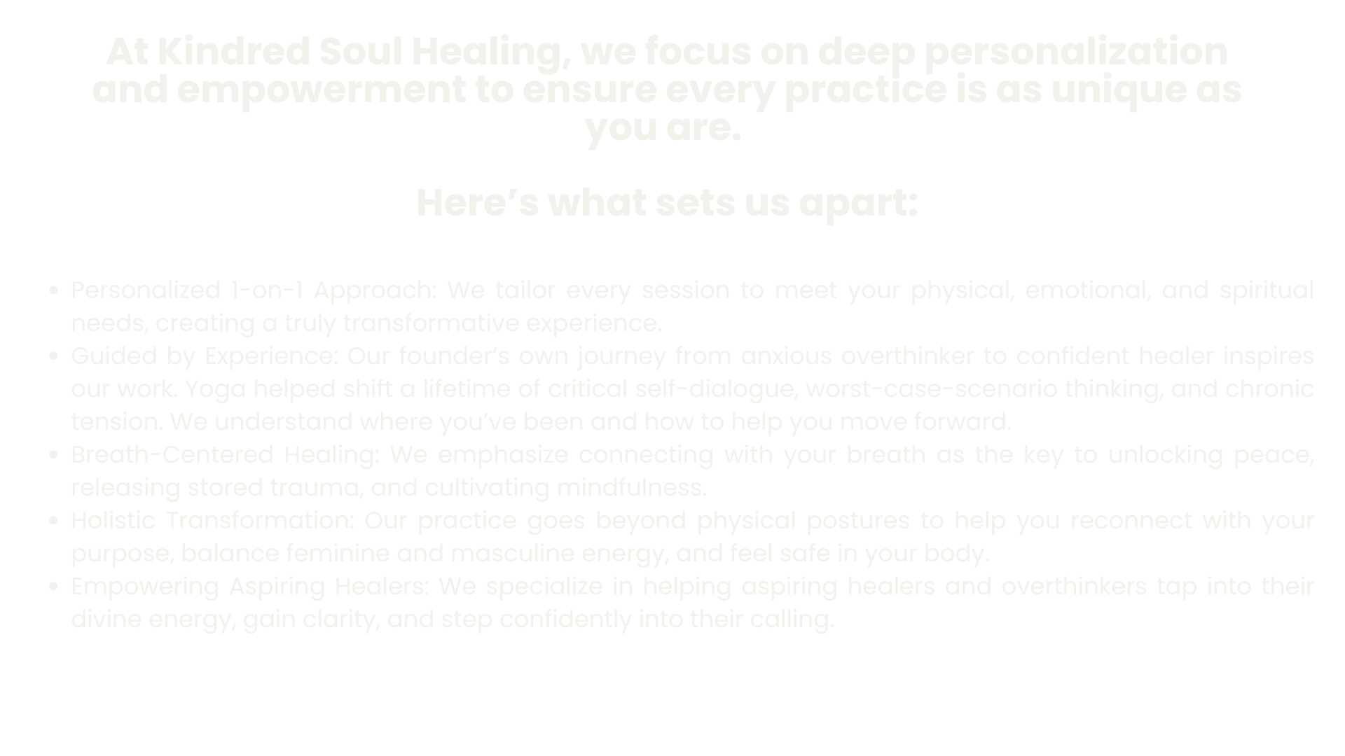 Kindred Soul Healing was born from a desire to create a space where transformation happens, not just on the mat, but within your body, mind, and spirit. My personalized 1-on-1 sessions give you permission to release the parts of yourself you’ve been holding back. Each session is tailored to your physical, emotional, and energetic needs, helping you move through stagnant energy, break free from self-limiting beliefs, release tension, and reconnect with your most authentic self.